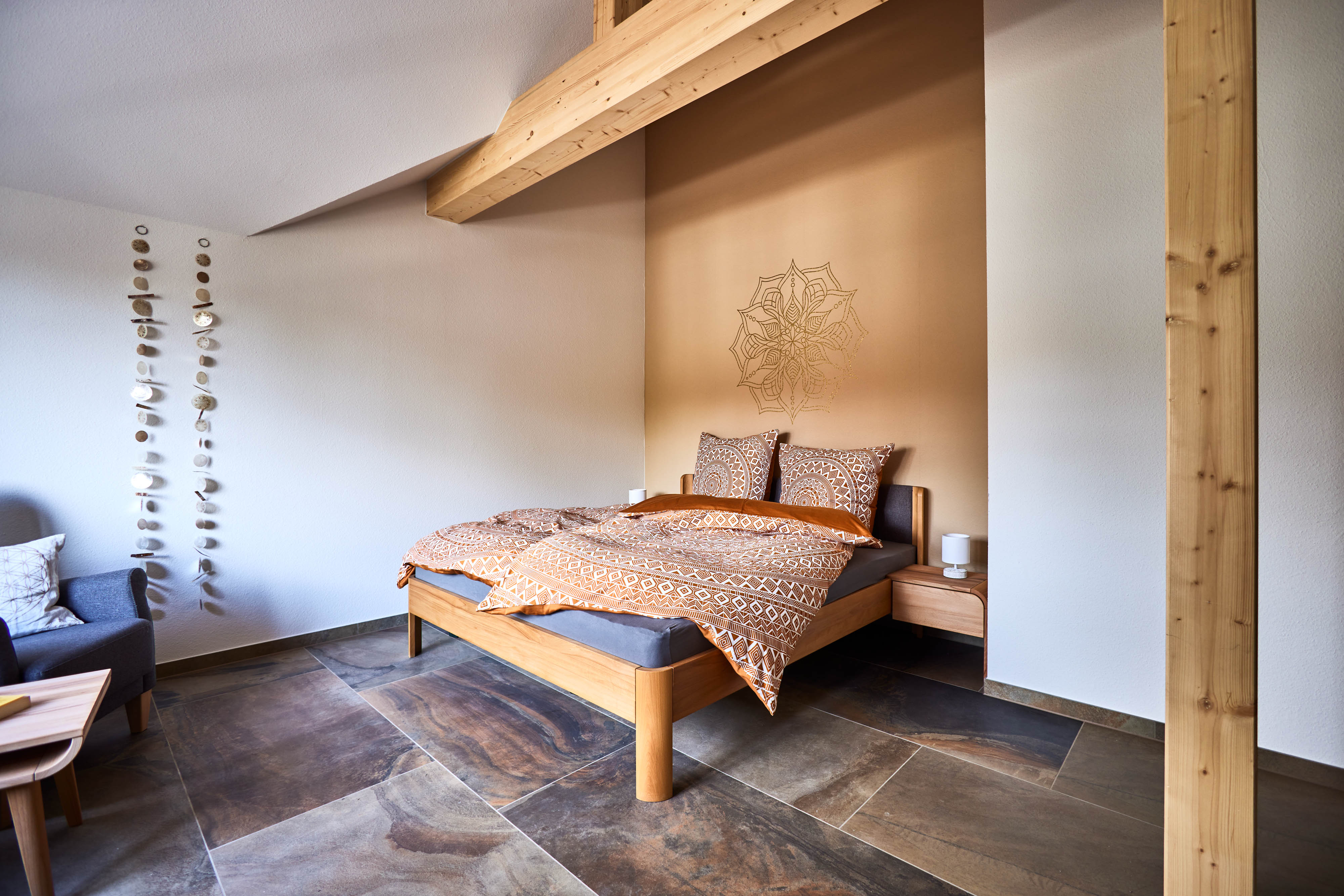 Wohnfläche incl. Bad 29 qm / Naturholzmöbel, geölt; Bett 180 × 200 cm